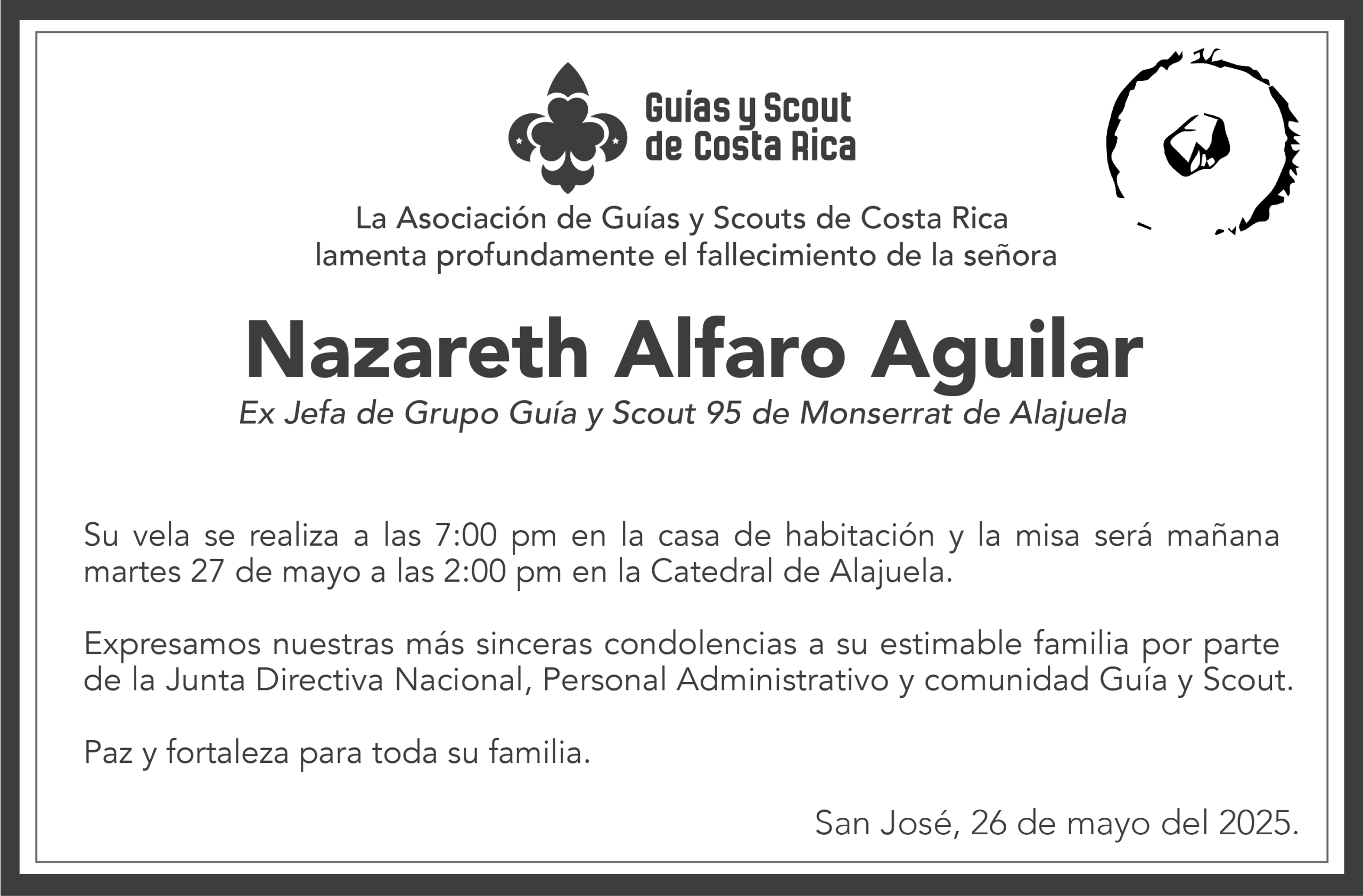 Por mi honor y con la ayuda de Dios, prometo hacer todo lo posible por cumplir mis deberes para con Dios y la Patria, ayudar al prójimo en toda circunstancia y cumplir fielmente la Ley Guía y Scout.